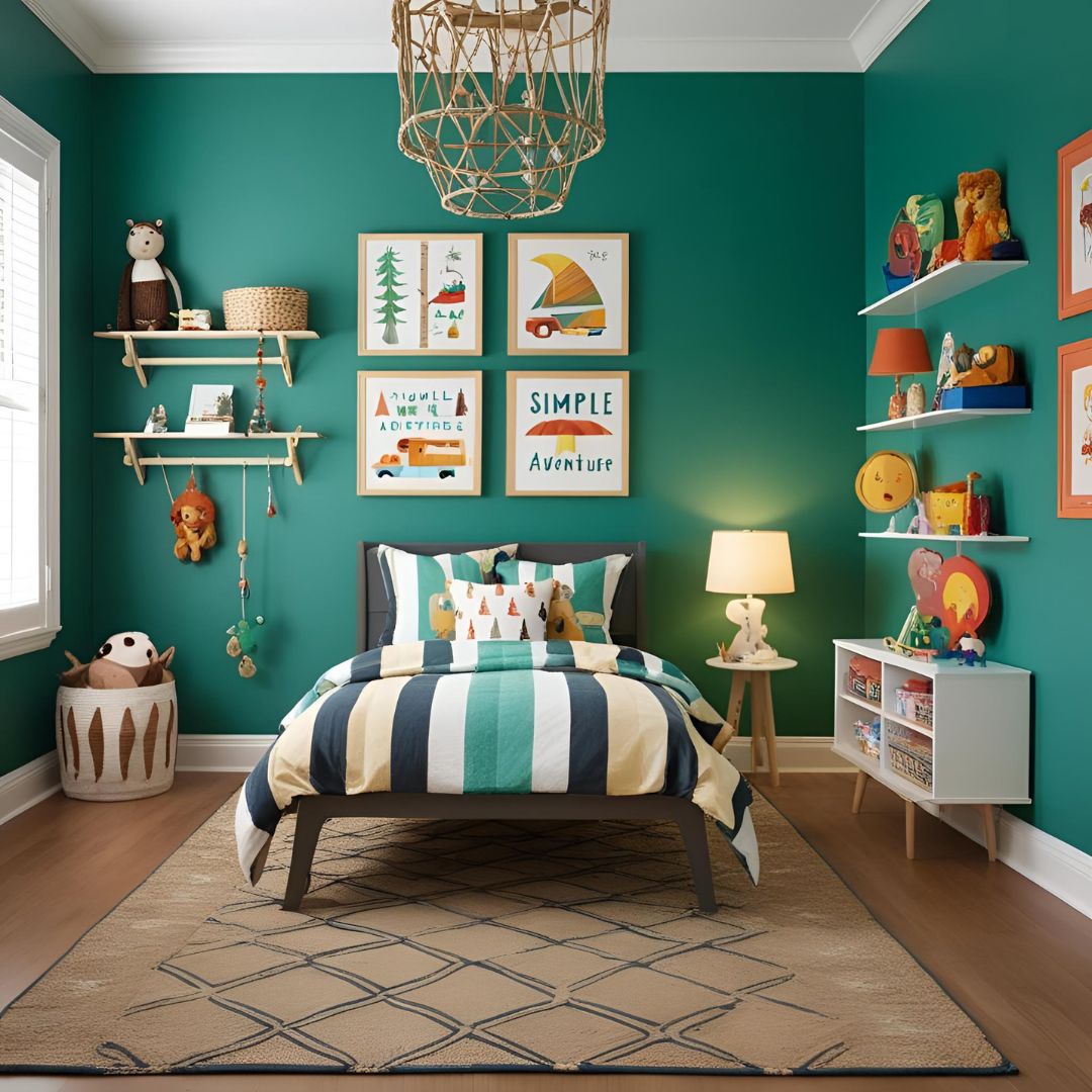 • Accents: Wall decals or murals (forest, space, jungle themes), adventure maps, and world globes