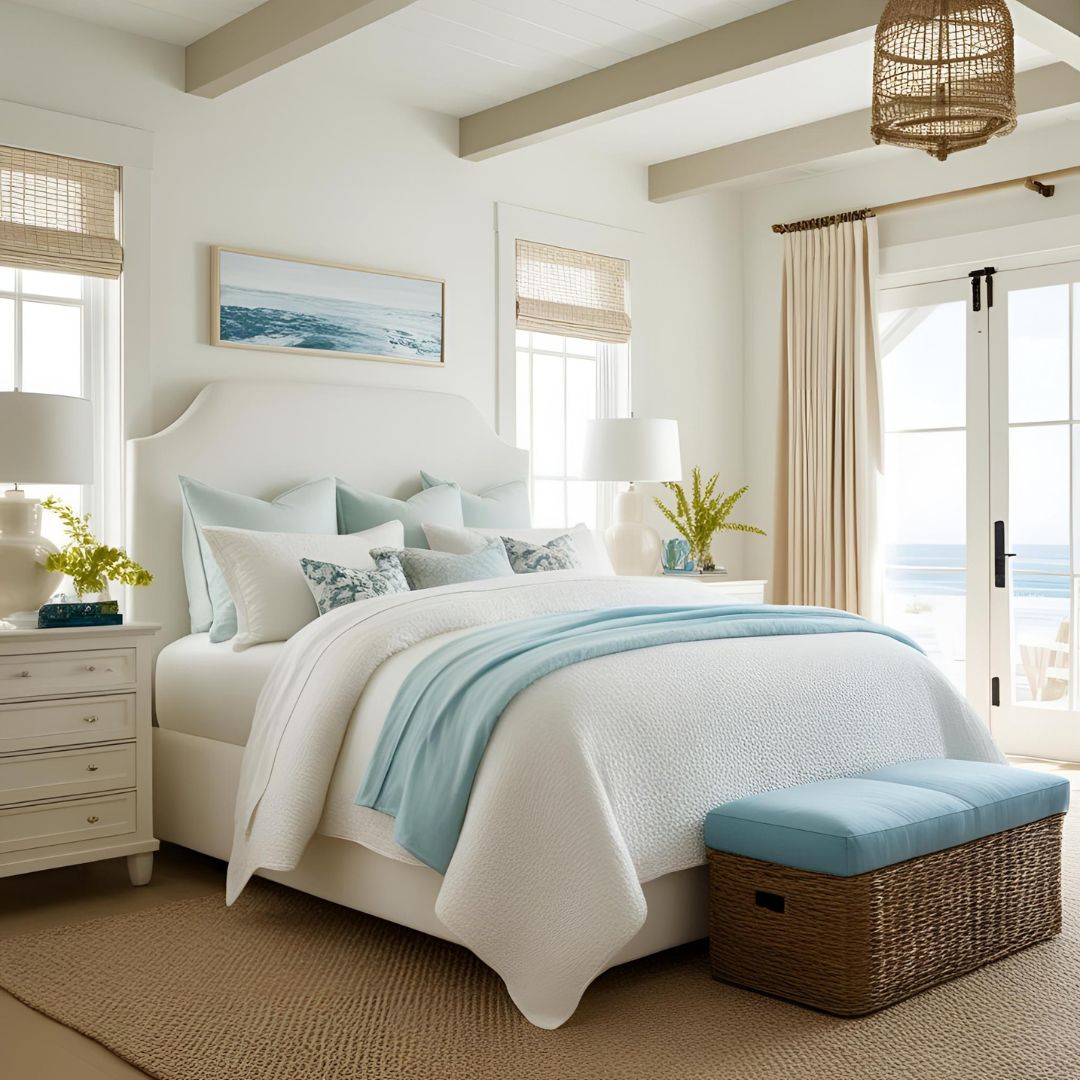 Incorporate wood, rattan, linen, and jute. A weathered wood bed frame or a woven headboard adds subtle beachside character without overwhelming the space.