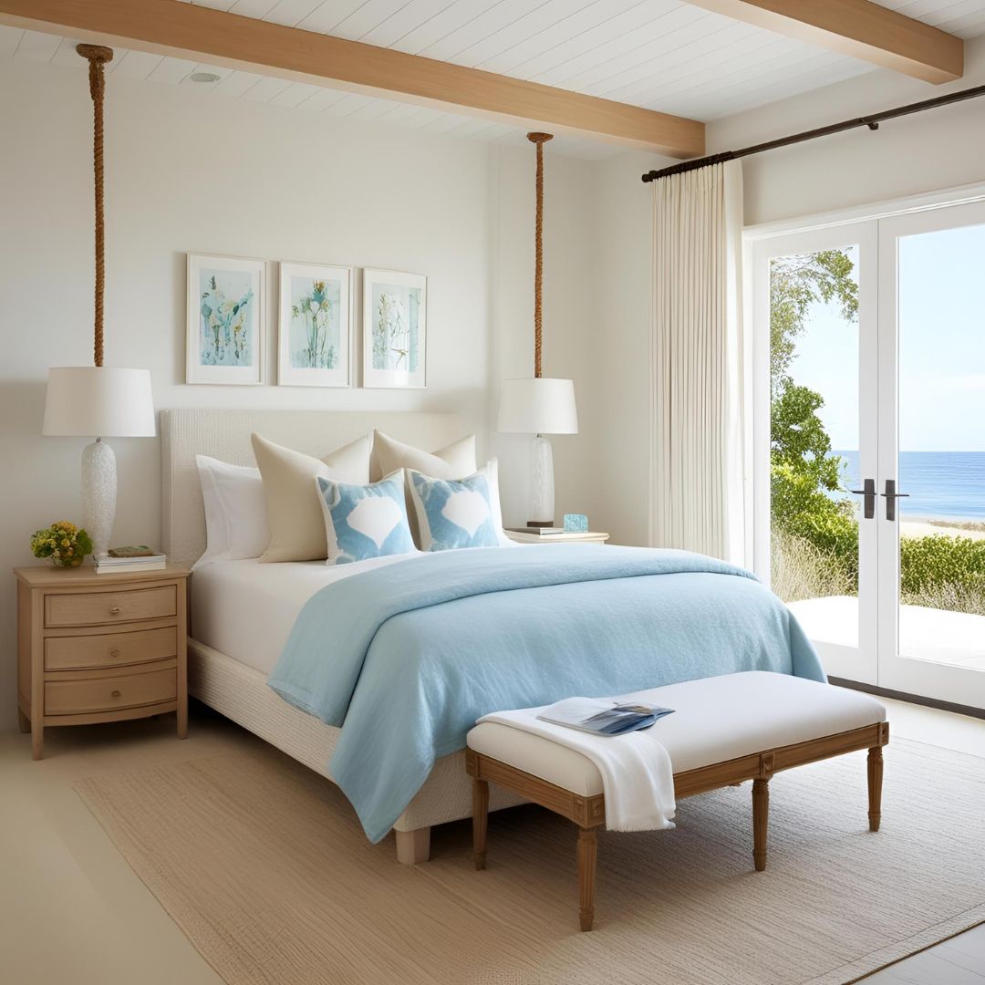 Soft whites, sandy beige, pale blues, and seafoam greens mirror the shoreline. These hues create a soothing backdrop that feels open and inviting.