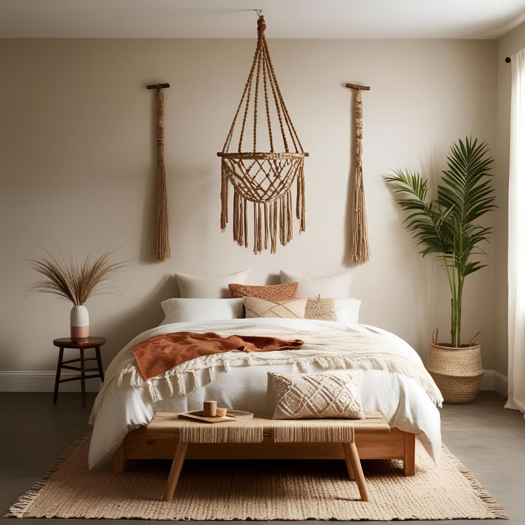 Wood, rattan, jute, and cane take center stage. A woven headboard or rustic wooden nightstand adds warmth and texture.