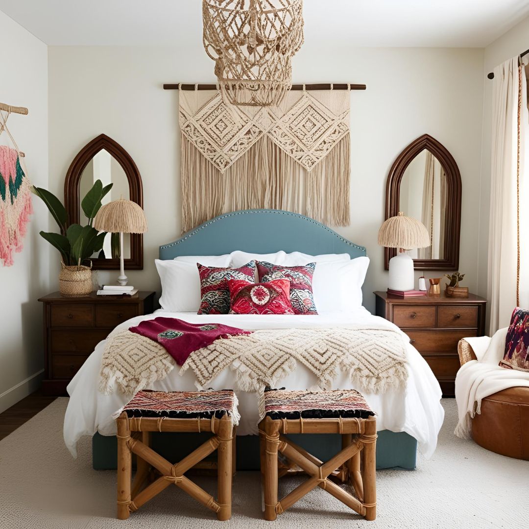 Mix and match textures—cotton, linen, macramé, and wool. Use layered rugs, tasseled throws, and patterned cushions for that relaxed boho feel.
