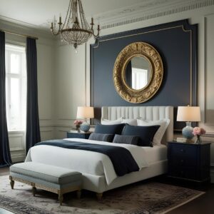 Wall mouldings, wainscoting, or decorative cornices bring a sense of formality and classical charm. A feature wall behind the bed enhances the grandeur.