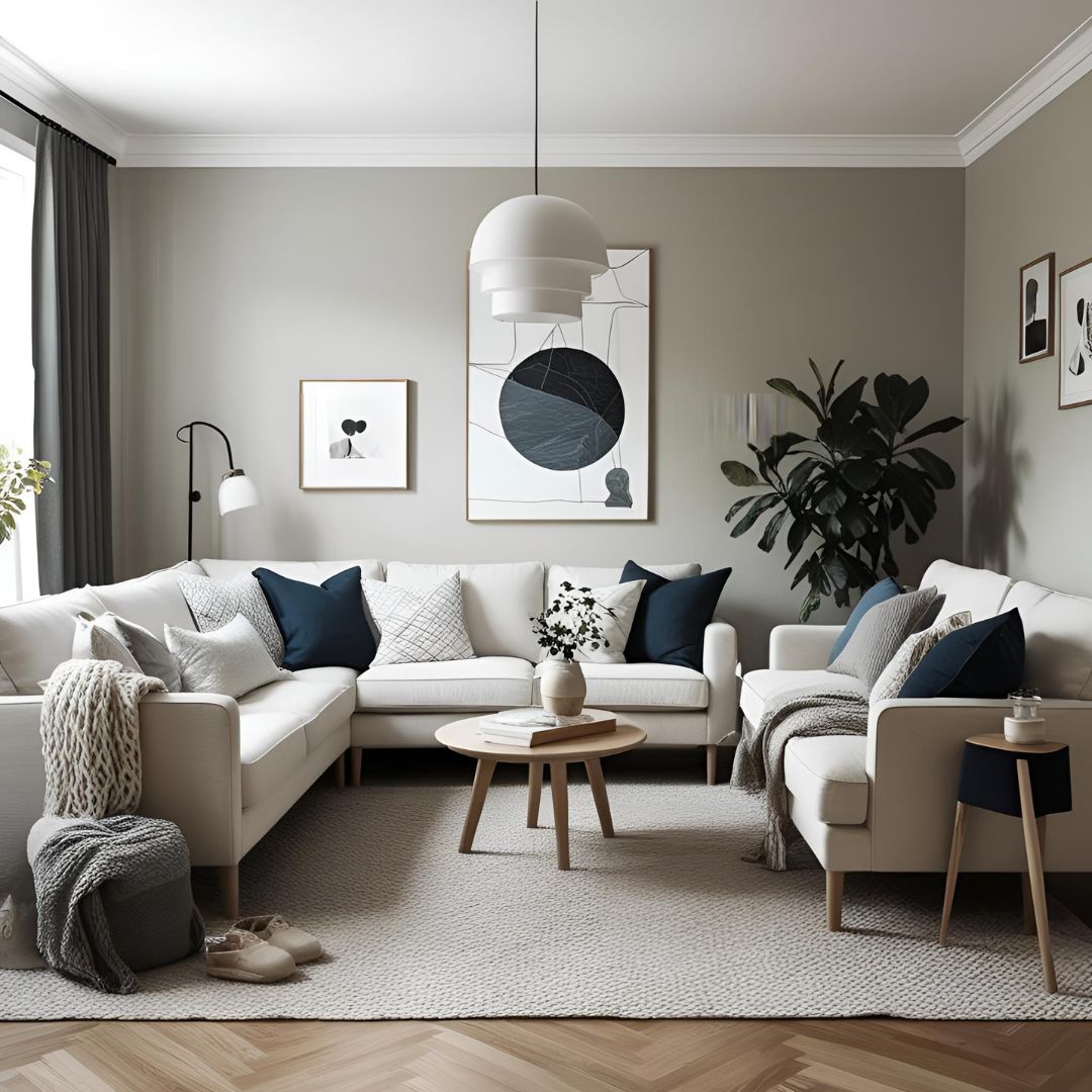 - Colors: Soft neutrals — whites, greys, beiges — paired with subtle pastels or charcoal accents