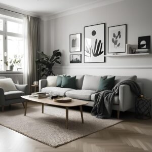 - Furniture: Sleek, low-profile sofas, light wood coffee tables, and mid-century-inspired pieces