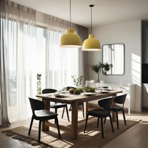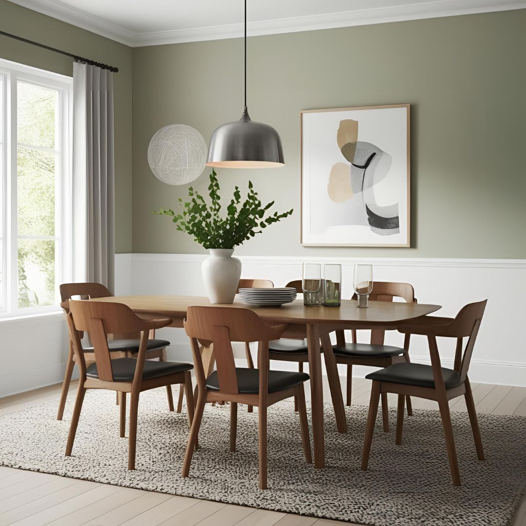 • Furniture: Simple, clean-lined wooden dining table, sleek chairs with minimalist design