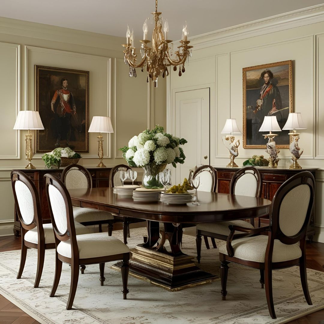 To create a refined and timeless dining space that embodies elegance, craftsmanship, and classic design. The Traditional dining room focuses on symmetry, rich materials, and ornate detailing to cultivate a sense of formality and comfort. It’s a space where family gatherings and fine dining take center stage.